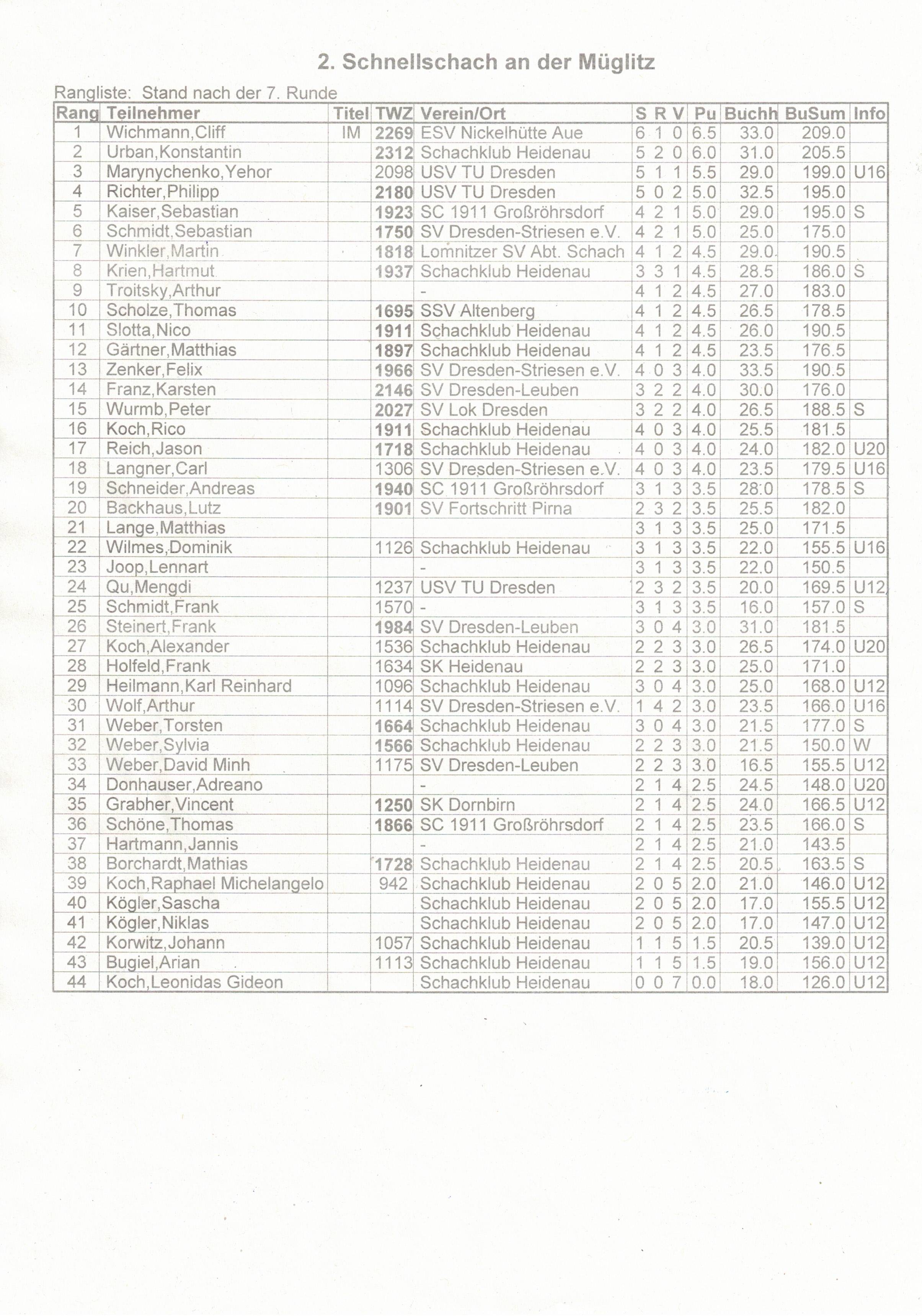 Nach 7 Runden konnte sich der Vorjahreszweite Cliff Wichmann (ESV Aue) knapp vor Konstantin Urban (beide ungeschlagen) und dem U16 Nachwuchstalent Yehor von der TU Dresden durchsetzen. Bester Heidenauer wurde Hartmut mit starken 4,5 Punkten auf Platz 8. Sehr starke Leistung auch Dominik (3,5 Punkte) und von Karl (3,0 Punkte).